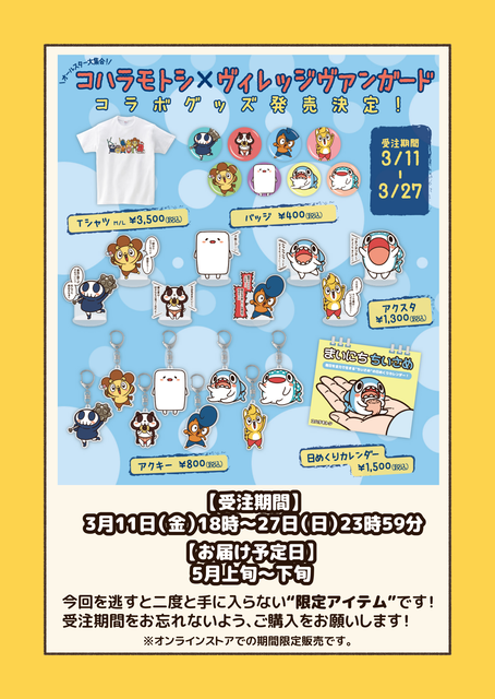 ヴィレヴァンコラボグッズ発売のお知らせ! 2022年03月11日 18:05 ヴィレヴァンさんとのコラボグッズが発売します!!第二弾の今回は、オールスター大集合です!受注期間は、「3/11(金)18:00~3/27(日) 23:59」オンラインストアでの期間限定販売なので、お見逃しなく!★商品詳細はコチラ★購入はコチラこうして、嬉しいお知らせができるのも、いつも応援してくださるおかげです!本当に、ありがとうございます!これからも、応援よろしくお願いします! 「お知らせ」カテゴリの最新記事 タグ :#お知らせ#漫画#創作#ちいさめ#アニワル#ぬりえかべ < 前の記事次の記事 > コメント コメントフォーム 名前 コメント 記事の評価 リセット リセット 顔 星 情報を記憶 コメントを投稿する
