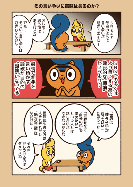 その言い争いに意味はあるのか? 2022年04月26日 17:40 Twitterは、テキストのやり取りだから…文字数の関係で伝えきれない事があったり、読解力がなくて間違って受け取られたりもするので、話し合いが難しい場合もある。 「アニワル」カテゴリの最新記事 タグ :#アニワル#漫画#考え方#人間関係 < 前の記事次の記事 > コメント コメントフォーム 名前 コメント 記事の評価 リセット リセット 顔 星 情報を記憶 コメントを投稿する