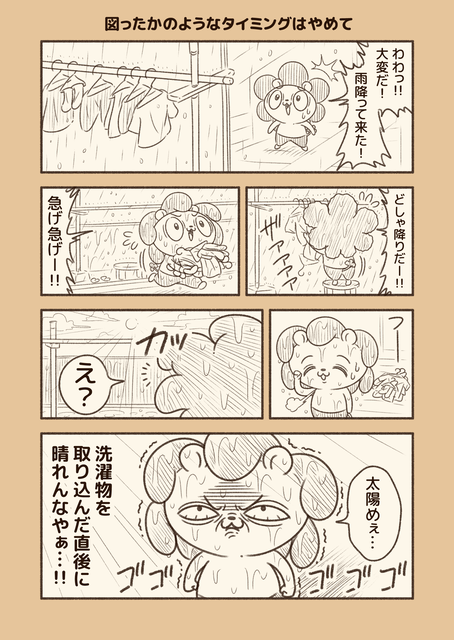 図ったかのようなタイミングはやめて 2023年05月15日 17:56 「取り込んだんだから、しばらくは雨降っとけ」って思ちゃった。必死に取り込む姿見てたろ?空気読んで、しばらくは顔を出すなよ太陽! 「漫画」カテゴリの最新記事 タグ :#漫画#あるある#日常#創作 < 前の記事次の記事 > コメント コメントフォーム 名前 コメント 記事の評価 リセット リセット 顔 星 情報を記憶 コメントを投稿する