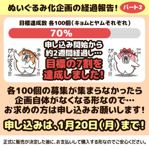 経過報告パート2! 2025年01月07日 16:18 \キョムスター&ヤムスターのぬいぐるみ化企画!/開始から約2週間で、目標の7割を達成しました!申し込みしてくださった方、本当にありがとうございます!このまま目標達成できるようにがんばります!期限は1月20日まで!●申し込みはこちら! 「お知らせ」カテゴリの最新記事 タグ :#お知らせ < 前の記事次の記事 > コメント コメントフォーム 名前 コメント 記事の評価 リセット リセット 顔 星 情報を記憶 コメントを投稿する