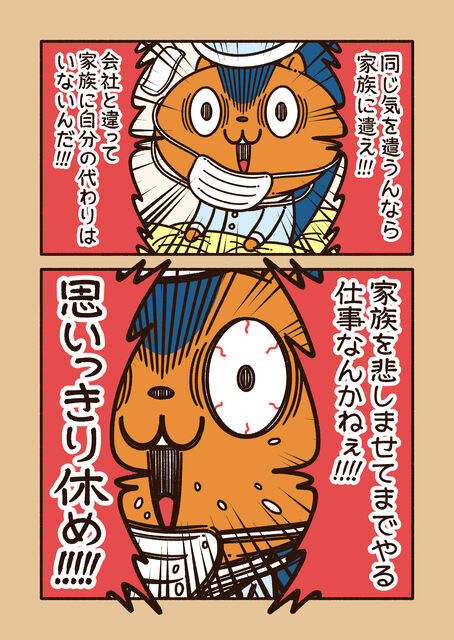体調が悪くても仕事を休めないあなたに物申す 2020年03月17日 16:13 新型コロナウイルスが世界的に流行しているので、本気で伝えたい!「風邪でも休めないあなたに」ってCMもあったけど…マジで、会社よりも“自分”を大切にしてくださいね!インフルエンザでも無理やり出社させる会社もあるようですが…そこまでしないと回らない会社は、経営の問題です。 社員は会社にとって何よりも大切な存在なので、休みやすい環境を作ってくれることを望みます! 「アニワル」カテゴリの最新記事 タグ :#アニワル#漫画#社会問題#社会#仕事#働き方#会社員 < 前の記事次の記事 > コメント コメントフォーム 名前 コメント 記事の評価 リセット リセット 顔 星 情報を記憶 コメントを投稿する