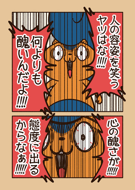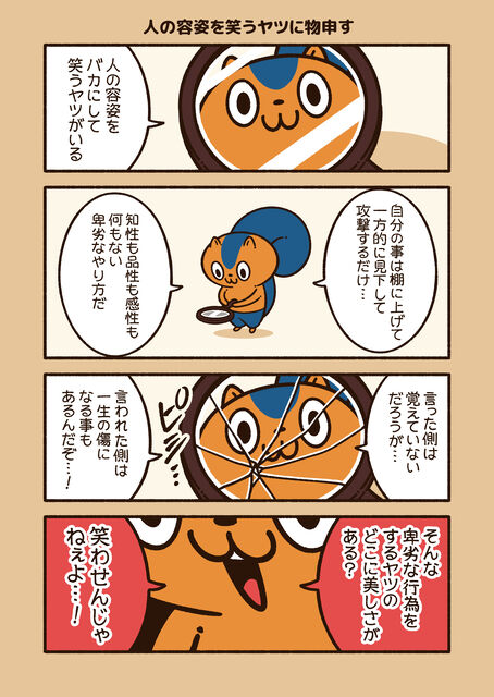 人の容姿を笑うヤツに物申す 2020年03月29日 19:00 人の“体”を傷つけてはいけない事は分かるのに、なぜ平気で“心”を傷つけるのか…。 そんな事をするヤツは、性根が腐ってる…! 「アニワル」カテゴリの最新記事 タグ :#アニワル#漫画#人間関係 < 前の記事次の記事 > コメント コメントフォーム 名前 コメント 記事の評価 リセット リセット 顔 星 情報を記憶 コメントを投稿する